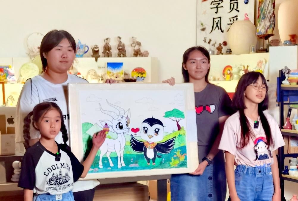 活動(dòng)期間,北京的劉心語(yǔ)、吳梓菡、文藝、吳辰希與西藏的旦增雍措、旦增尼瑪、徐杰、索朗央珍等兩地青少年代表,通過(guò)“同繪一幅畫(huà)”的方式,將西藏的藏羚羊與北京的雨燕巧妙地融合在一個(gè)畫(huà)面之中。畫(huà)作中,一邊是象征北京自由與活力的“空中旅行家”雨燕在無(wú)邊的藍(lán)天中翱翔,另一邊則是代表西藏堅(jiān)韌與生機(jī)的藏羚羊在遼闊的無(wú)人區(qū)自由奔跑。盡管兩者習(xí)性迥異、棲息地不同,它們共同展現(xiàn)了自由無(wú)束的特質(zhì),寓意著京藏兩地青少年盡管生活在不同的文化環(huán)境中,卻都能追求自由和快樂(lè)的成長(zhǎng)。正如北京的孩子們說(shuō):“我們把來(lái)自拉薩的藏羚羊和來(lái)自北京的小雨燕聚集到一起,畫(huà)在了一個(gè)畫(huà)面中。看:藏羚羊戴著藏族耳飾,小雨燕身著云領(lǐng)服飾,她們是盛裝出席啊。就像我們,北京和西藏的同學(xué)們,手拉著手,心連著心,書(shū)信往來(lái),學(xué)習(xí)探究,相互幫助,一起成長(zhǎng)?!蔽鞑氐暮⒆诱f(shuō):“我們就像畫(huà)中的藏羚羊和北京雨燕一樣,心手相牽,互相鼓舞,用積極的態(tài)度學(xué)習(xí)、生活,成為祖國(guó)的好少年!”。