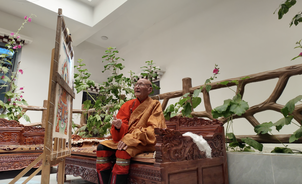 記者9月在西藏昌都市卡若區(qū)嘎瑪鄉(xiāng)見(jiàn)到92歲的嘎瑪?shù)吕諘r(shí),他坐在家中的暖閣里作畫(huà),外孫丁增平措從旁協(xié)助。
