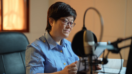 沈建萍在錄制列車(chē)廣播信息。