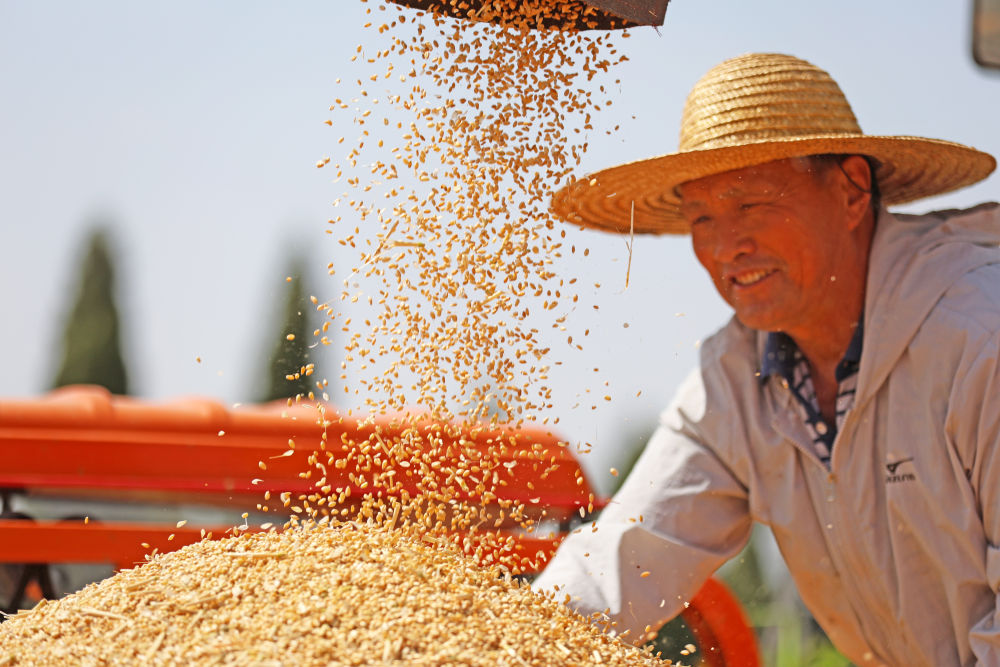 5月25日,山東省臨沂市郯城縣郯城街道山南頭村村民將收獲的小麥裝車(chē)。新華社發(fā)(張春雷 攝)