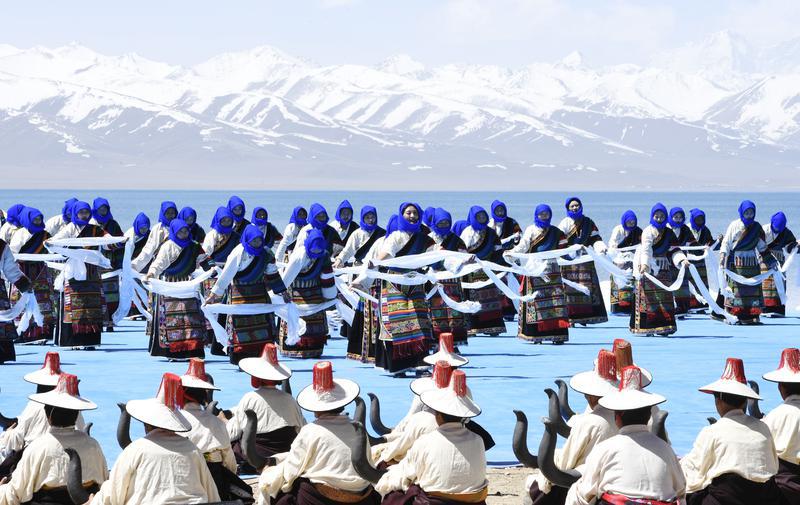 5月19日,在距拉薩市區(qū)240公里、海拔4718米的納木措湖邊,一場(chǎng)盛大的“開(kāi)湖日”活動(dòng),將西藏“圣湖”納木措的美展現(xiàn)在國(guó)內(nèi)外約200名賓客眼前。圖為舞蹈演員在納木錯(cuò)開(kāi)湖活動(dòng)現(xiàn)場(chǎng)表演。記者 旦增蘭澤 攝