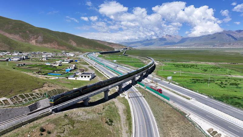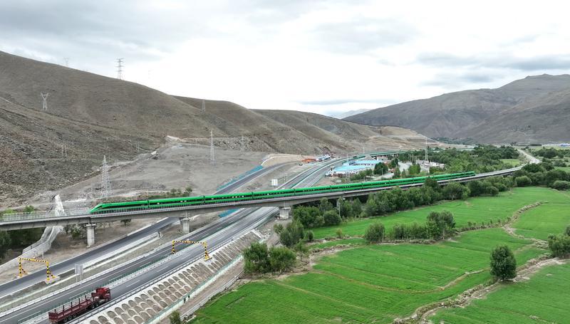 6月30日,G4218雅安至葉城國(guó)家高速公路拉薩至日喀則機(jī)場(chǎng)段項(xiàng)目建成通車(chē)。圖為318國(guó)道 、拉日鐵路 、拉日高等級(jí)公路 交錯(cuò)并行。記者 索朗群培 次旦央吉 扎西頓珠
