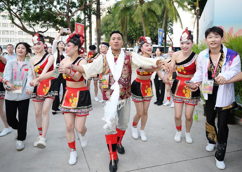 11月22日,由國(guó)家民委和國(guó)家體育總局主辦、海南省人民政府承辦的第十二屆全國(guó)少數(shù)民族傳統(tǒng)體育運(yùn)動(dòng)會(huì)在海南三亞開(kāi)幕。圖為第十二屆全國(guó)少數(shù)民族傳統(tǒng)體育運(yùn)動(dòng)會(huì)西藏代表團(tuán)民族健身操運(yùn)動(dòng)員賽后與福建代表團(tuán)運(yùn)動(dòng)員一起跳鍋莊。