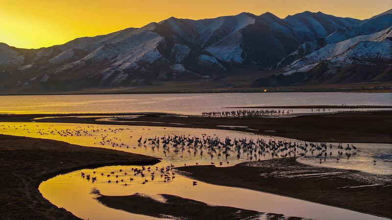 11月14日,拉薩市林周縣虎頭山水庫(kù)旁,一群黑頸鶴正悠閑的曬著太陽(yáng)。晉巴次成 攝