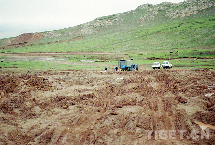 過(guò)去,由于交通不便,從班戈縣通往雙湖辦事處(現(xiàn)雙湖縣)的草原路,汽車常遭遇陷車等困難。這是過(guò)去汽車通過(guò)的一段泥濘路(唐召明2001年攝)