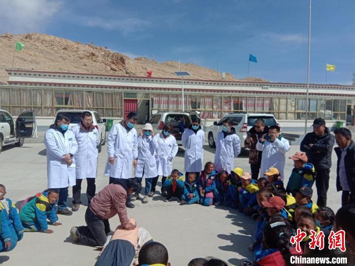 醫(yī)療隊(duì)為波絨鄉(xiāng)中心小學(xué)師生進(jìn)行心肺復(fù)蘇現(xiàn)場培訓(xùn)?!熍_(tái)援藏醫(yī)療隊(duì)供圖