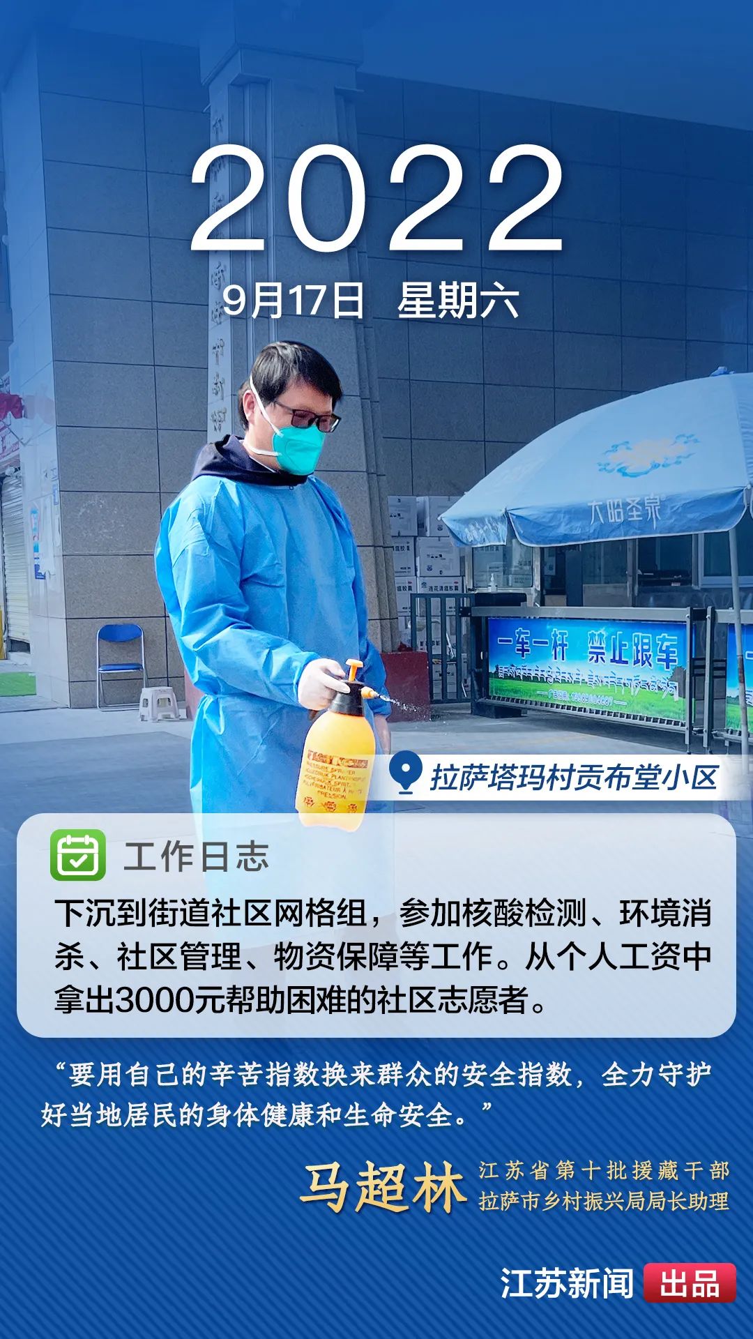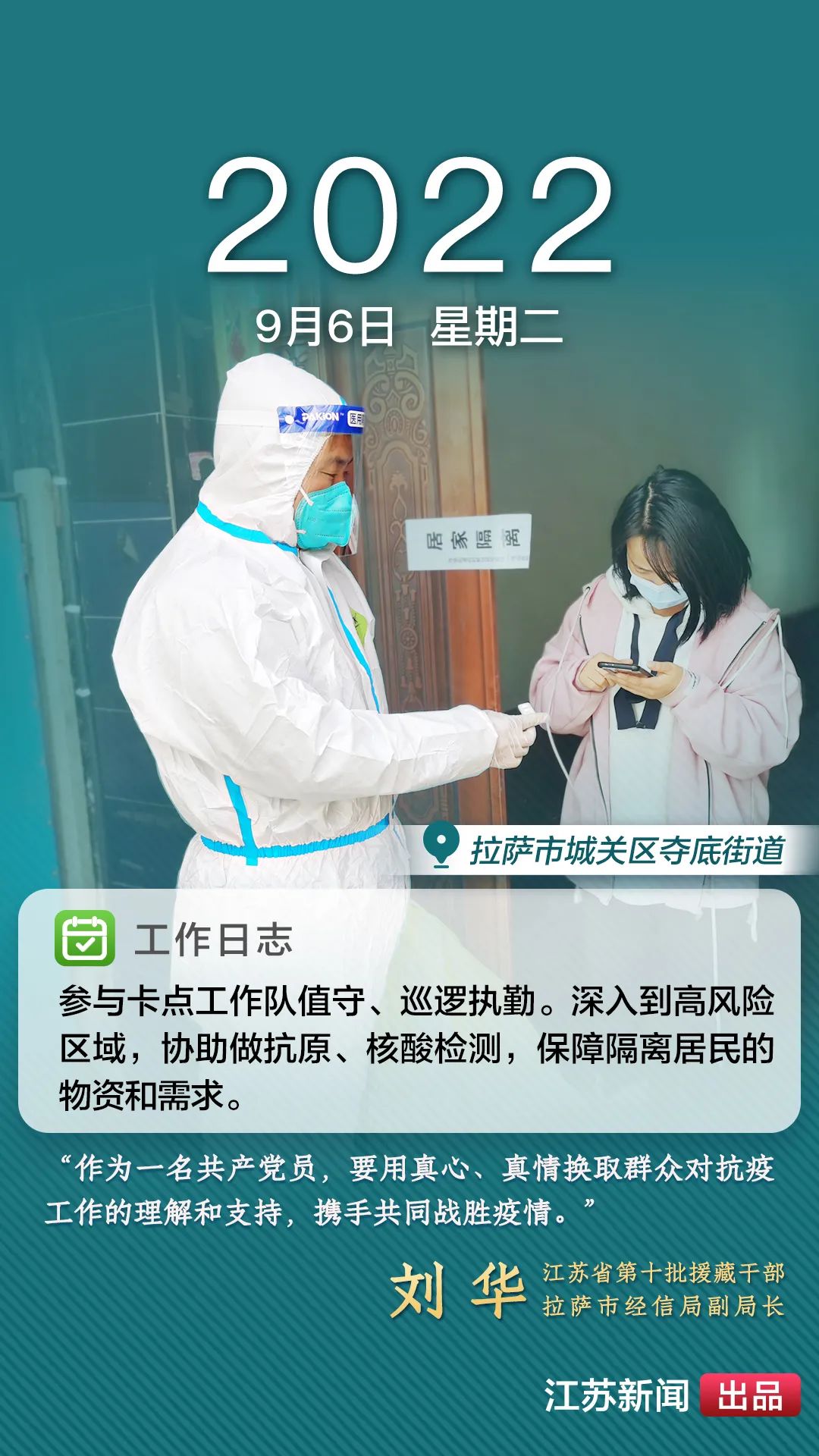 2022年8月,一場(chǎng)突如其來的新冠肺炎疫情襲擊拉薩。江蘇援藏前方指揮部樹立高度的政治意識(shí),堅(jiān)決貫徹江蘇省委、省政府主要領(lǐng)導(dǎo)批示精神和自治區(qū)、拉薩市部署要求,全力以赴做好疫情防控工作。第十批援藏干部人才克服初到高原的身體反應(yīng),服從服務(wù)大局、勇于擔(dān)當(dāng)作為,迅速投身疫情防控工作一線,以實(shí)際行動(dòng)展現(xiàn)江蘇援藏的鐵軍作風(fēng)。近期,我們將陸續(xù)推出江蘇援藏干部人才抗疫身影,敬請(qǐng)關(guān)注。