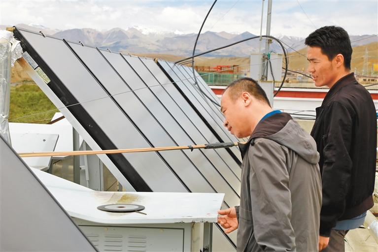 圖為香孜鄉(xiāng)干部在檢查太陽能供熱設備。記者 永青 扎西羅布 攝