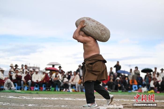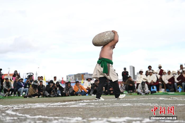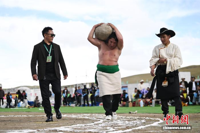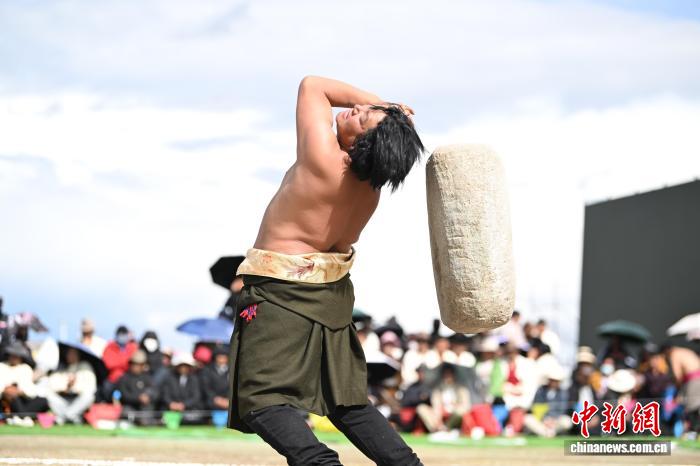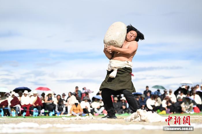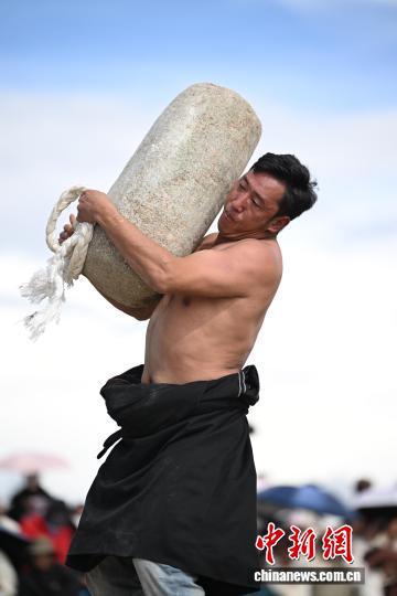 9月5日,2025年那曲市恰青賽馬節(jié)在格薩爾賽馬場(chǎng)開幕。當(dāng)日,賽場(chǎng)中不僅有駿馬飛馳,更有力量的精彩較量。在抱石頭比賽現(xiàn)場(chǎng),來自那曲市各縣(區(qū))的男女選手們鼓足干勁,挑戰(zhàn)自我。這項(xiàng)傳統(tǒng)體育項(xiàng)目,展現(xiàn)了藏北人民的堅(jiān)韌與力量。圖為男參賽選手在抱石頭比賽。中新社記者 貢嘎來松 攝