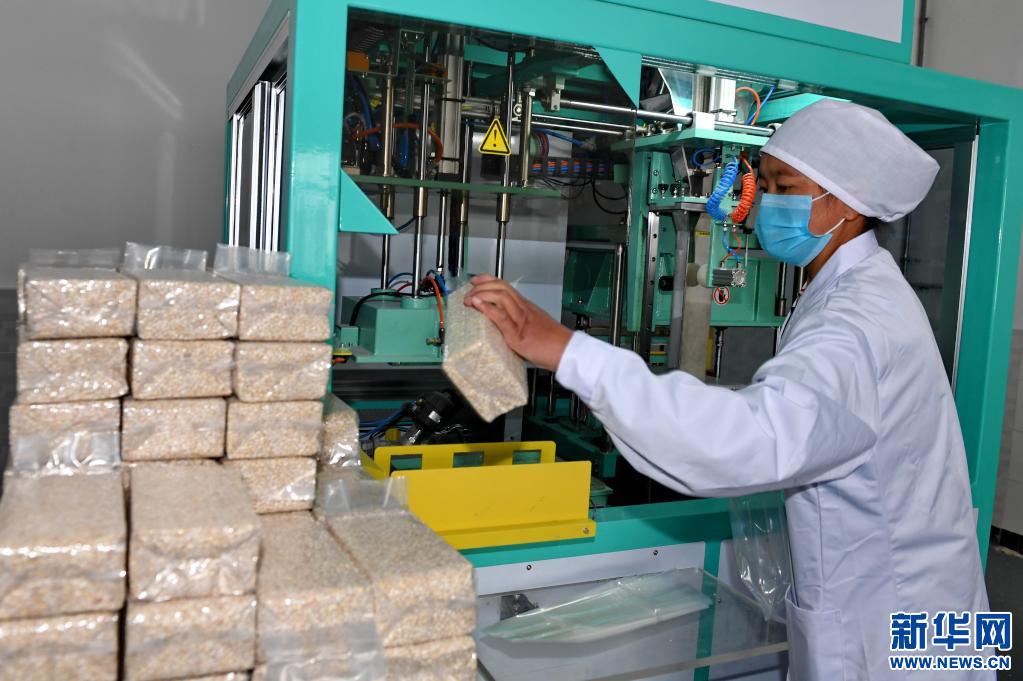 青稞加工廠(chǎng)的工人正在將青稞米裝袋(2017年4月27日攝)。新華社記者 張汝鋒 攝