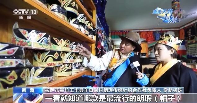 拉薩市墨竹工卡縣羊日崗村朗瑕傳統(tǒng)針織合作社負責人 索朗頓珠:我們這的姑娘小伙兒,一看就知道哪款是最流行的朗瑕(帽子),這是個去年款,這個是今年的款。你看,這兩個是牦牛角。朗瑕(帽子)很有我們藏族特色,同時也在與時俱進,看這些做工、花紋越來越精致了。