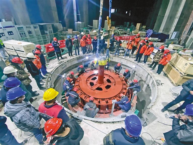 西藏湘河水利樞紐首臺(tái)機(jī)組轉(zhuǎn)子吊裝成功