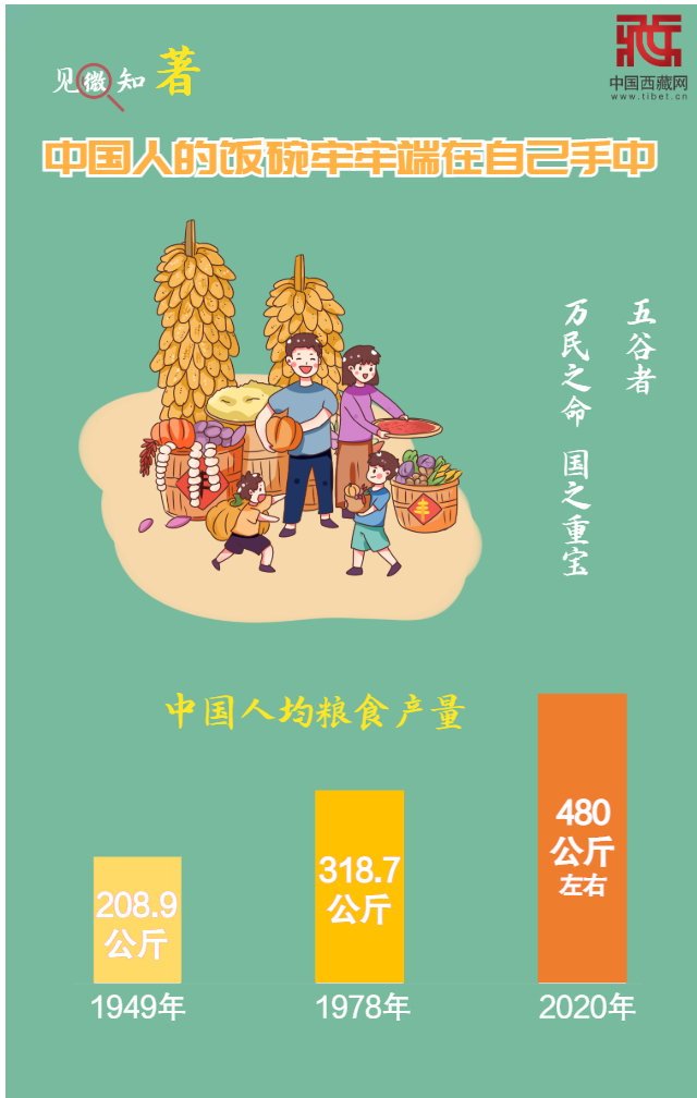 民以食為天。2020年,我國糧食又高位增產(chǎn),供需總量基本平衡。中國人均糧食產(chǎn)量,從1949年的208.9公斤,到1978年的318.7公斤,再到2020年的480公斤左右,高于400公斤的國際糧食安全標(biāo)準(zhǔn)線。中國人的飯碗牢牢端在自己手中。(中國西藏網(wǎng) 制圖/楊月云)