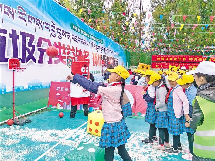 在拉薩市城關(guān)區(qū)組織開展的“不忘初心、牢記使命”主題教育暨“垃圾分類黨員先行 守護(hù)凈土人人有責(zé)”活動(dòng)現(xiàn)場(chǎng),學(xué)生代表參加趣味游戲。