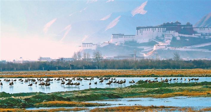 遠處,連綿起伏的山頂還覆蓋著薄薄的積雪,布達拉宮雄偉而秀美;近處,濕地內(nèi)隨意顯現(xiàn)出的一塊塊水泊,成群的候鳥在水中玩耍嬉戲、在藍天白云下飛舞。見到可愛的飼養(yǎng)員帶來它們喜歡的麥粒,斑頭雁、紅隼、赤麻鴨、黃鴨等紛紛游上岸來,盡情地享受美食,發(fā)出歡快的叫聲。