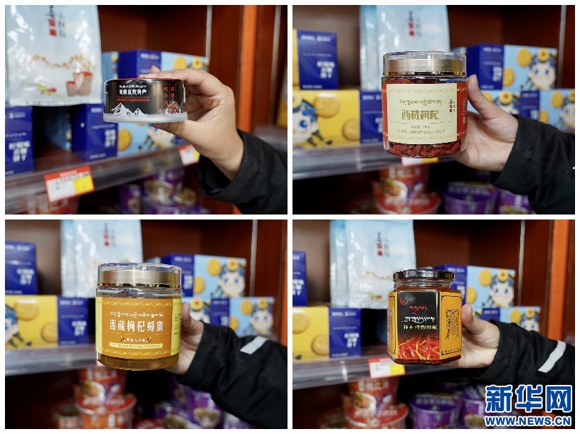 拼版照片:扶貧專柜內擺放的日喀則特色產品(10月24日攝)。新華網 達珍 攝