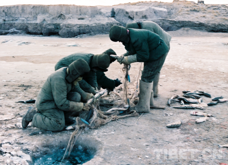 這是冬季在藏北無人區(qū)扎加藏布的破冰打魚人(唐召明1990年初攝)