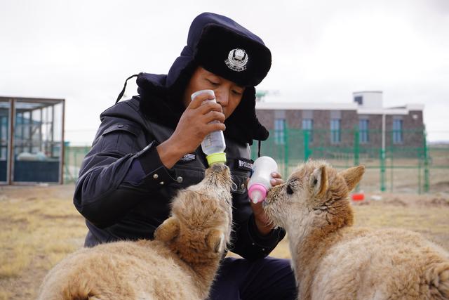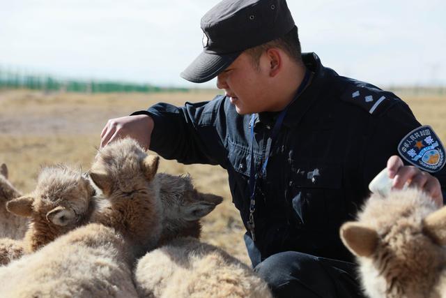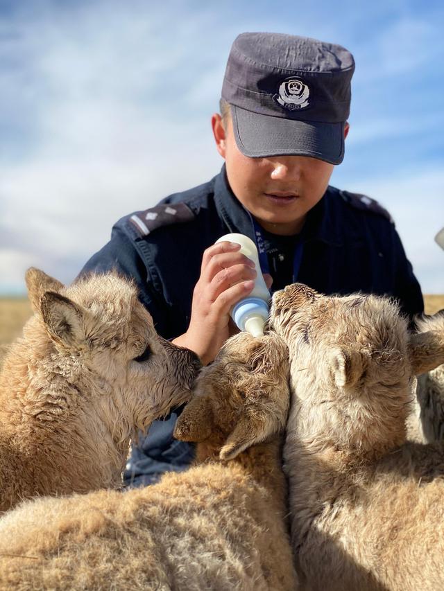 12月7日,在給藏羚羊幼仔喂奶前,可可西里索南達杰保護站站長趙新錄(中)用嘴測試奶溫。
