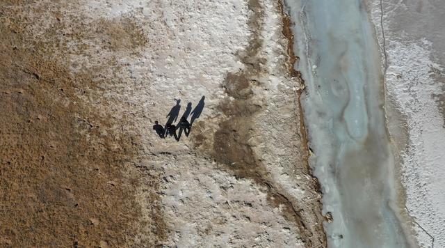 12月7日,站長趙新錄(中)與隊友鄧海平(左)、達才在可可西里索南達杰保護站管護區(qū)域內(nèi)巡查(無人機照片)。