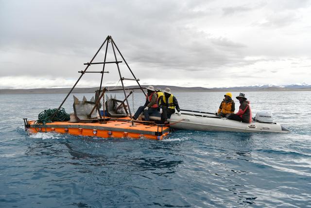 第二次青藏科考納木錯(cuò)湖泊科考團(tuán)隊(duì)利用搭建好的水上平臺(tái),計(jì)劃鉆取100米深的湖芯,分析研究納木錯(cuò)地區(qū)10到20萬年以來古氣候的演變過程及其機(jī)理。圖為2019年7月6日,科研人員駕船推動(dòng)浮動(dòng)平臺(tái)到指定區(qū)域投放錨鏈。新華社記者 李鑫 攝