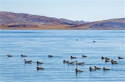 羊卓雍錯(cuò)自2014年被納入國家良好湖泊生態(tài)環(huán)境保護(hù)試點(diǎn)工程項(xiàng)目以來,羊卓雍錯(cuò)周邊生態(tài)環(huán)境持續(xù)向好,棲息繁衍的野生動物數(shù)量逐年增多。這是近日拍攝的羊卓雍錯(cuò)湖面上的水鳥。新華社記者 孫非 攝