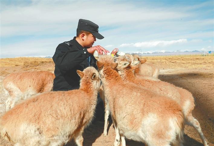 可可西里巡山隊(duì)員鄧海平給藏羚羊幼仔喂奶(2020年12月6日攝)。新華社記者 王艷 攝