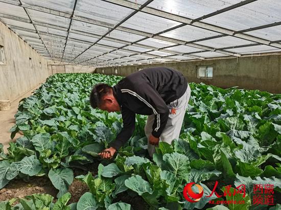 扎西旺杰在蔬菜大棚查看花菜長(zhǎng)勢(shì)。 李海霞 攝