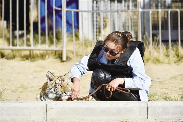 當(dāng)記者看到四只幼獅時(shí),它們時(shí)而聚在一起,時(shí)而沿著籠子邊溜達(dá),時(shí)而張開大嘴向著外人示威,還有一個(gè)非?;钴S的在攀爬籠子。小老虎次仁卓瑪雖然沒有兄弟姐妹的陪伴,不過園區(qū)的獸醫(yī)小姐姐成了它最貼心的玩伴。每天,獸醫(yī)小姐姐都會(huì)帶著次仁卓瑪進(jìn)行戶外活動(dòng),次仁卓瑪像小朋友一樣喜歡玩皮球,喜歡追著獸醫(yī)小姐姐跑,還特別喜歡獸醫(yī)小姐姐給它按摩,經(jīng)常會(huì)撒嬌求抱抱。