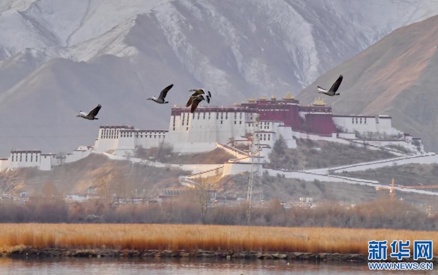 斑頭雁飛翔在拉魯濕地上空(3月7日攝)。新華社記者 張汝鋒 攝