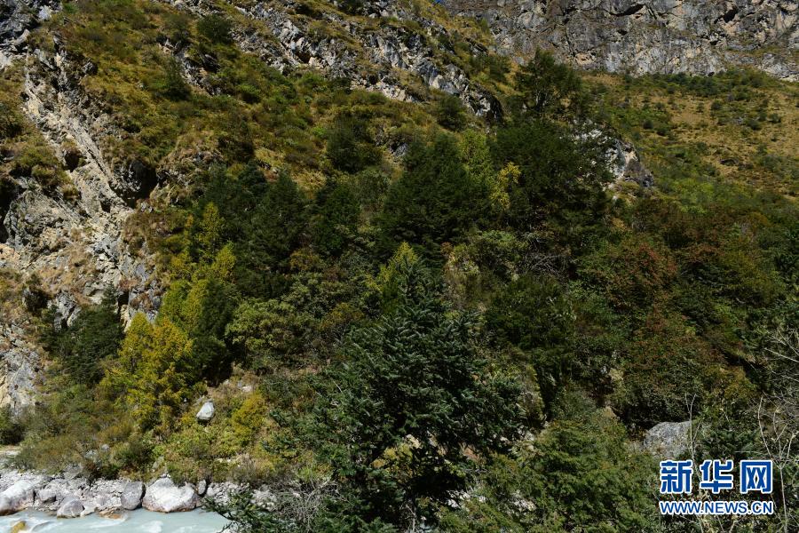 這是西藏定日縣絨轄溝內(nèi)一片含有密葉紅豆杉的植物群落(2020年10月29日攝)。新華社發(fā) 趙明旭 攝