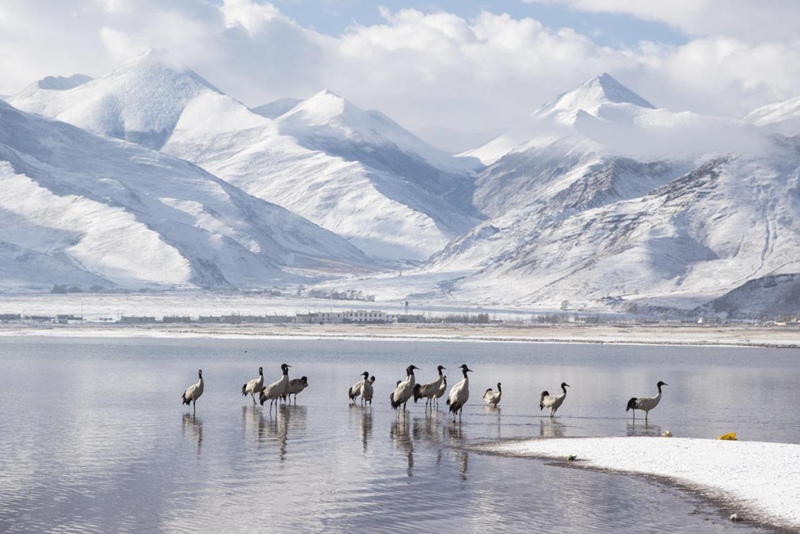 見過銀裝素裹的拉薩,但你一定沒見過在漫天白雪中盡情飛舞的黑頸鶴。茫茫天地間,優(yōu)雅的黑頸鶴沐浴著陽光,直沖云霄。時值3月,在拉薩林周悠閑越過一冬的黑頸鶴,即將北上,開始新一季的遷徙。這春雪,仿佛就是送給它的離別禮物。