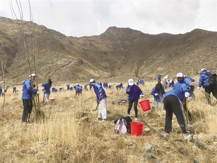 圖為青年志愿者在拉薩市堆龍德慶區(qū)“西藏青年志愿者林”義務(wù)植樹。次仁羅布 李洲 攝