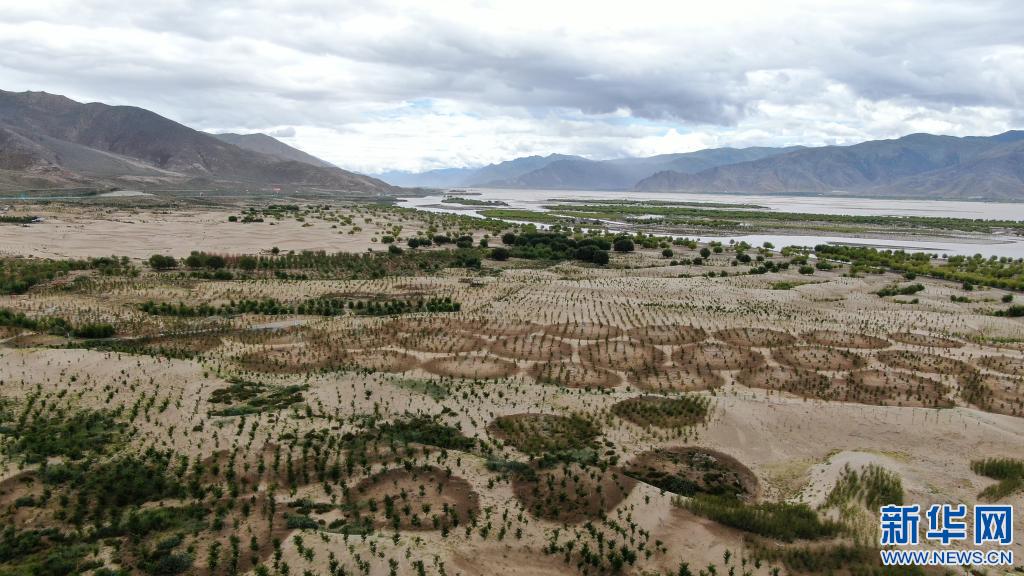 雅魯藏布江山南段沙丘上人工造林的樹苗(7月20日 無人機攝)。新華社記者 晉美多吉 攝
