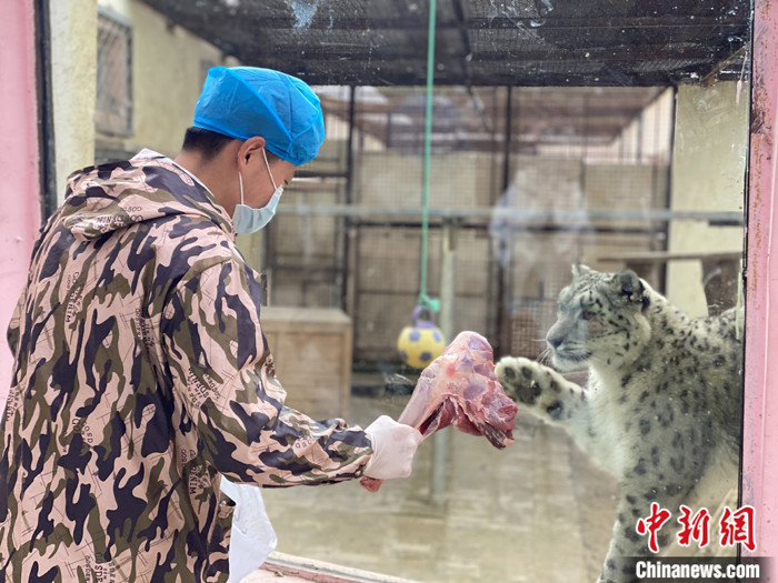 11月5日,史壽軍拿著羊腿與雪豹隔著玻璃互動。 中新社記者 李江寧 攝