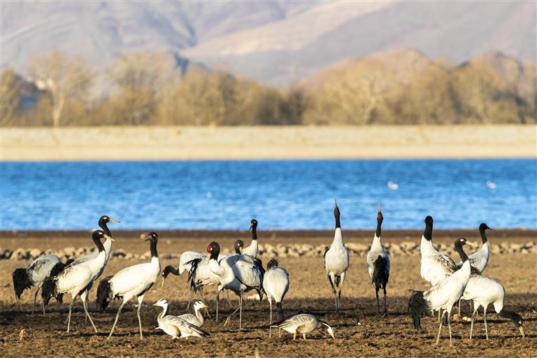 隨著西藏不斷加大黑頸鶴棲息地保護力度,黑頸鶴的生存環(huán)境進一步改善。每年十月中下旬,大批黑頸鶴從藏北高原飛到拉薩河谷,它們在農(nóng)田、沼澤地里覓食嬉戲,享受冬日暖陽。
