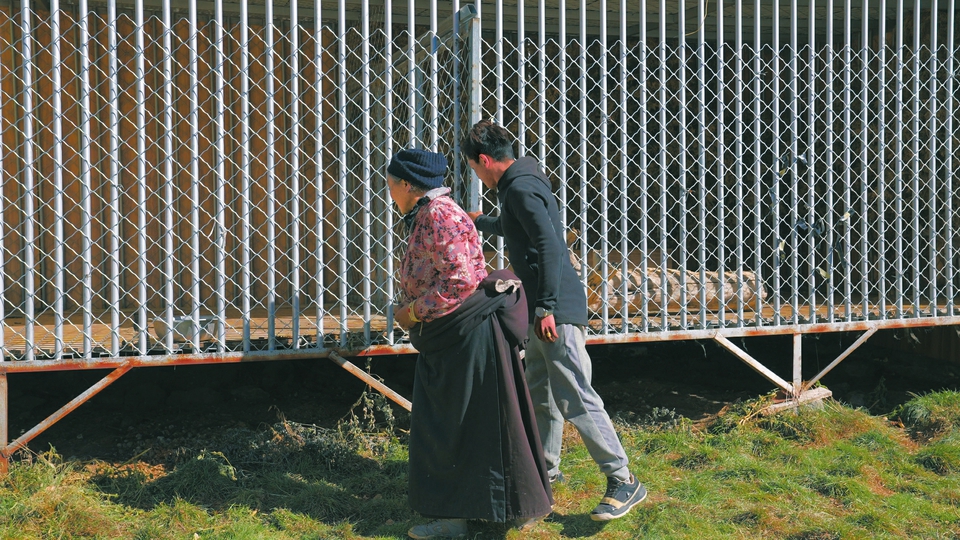 “在巖壁下發(fā)現(xiàn)了它,因?yàn)榱餮^多已經(jīng)奄奄一息了。它的一個(gè)前肢斷了,現(xiàn)在走路還是一瘸一拐的。”同為護(hù)林員的根呷介紹,當(dāng)時(shí)這只雪豹在同另外一只雪豹搶食落敗后受傷,因?yàn)檎孢_(dá)鄉(xiāng)尚未建立動(dòng)物救助中心,雪豹便寄養(yǎng)在甲它家中。鄉(xiāng)政府出資修建了雪豹居住的“鐵籠”,甲它負(fù)責(zé)給它喂食,甲它的妻子則每隔一段時(shí)間就要為這頭猛獸打掃一次圈舍。