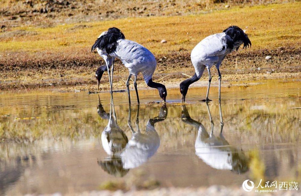 覓食中的黑頸鶴。人民網 李海霞 攝