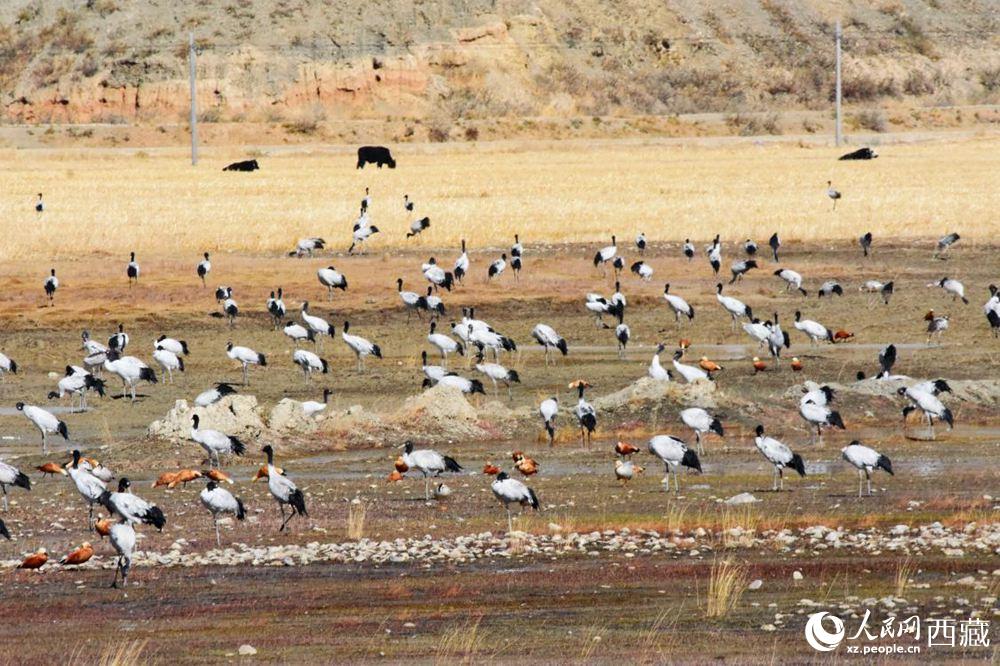 黑頸鶴在收割完的青稞地。人民網 李海霞 攝