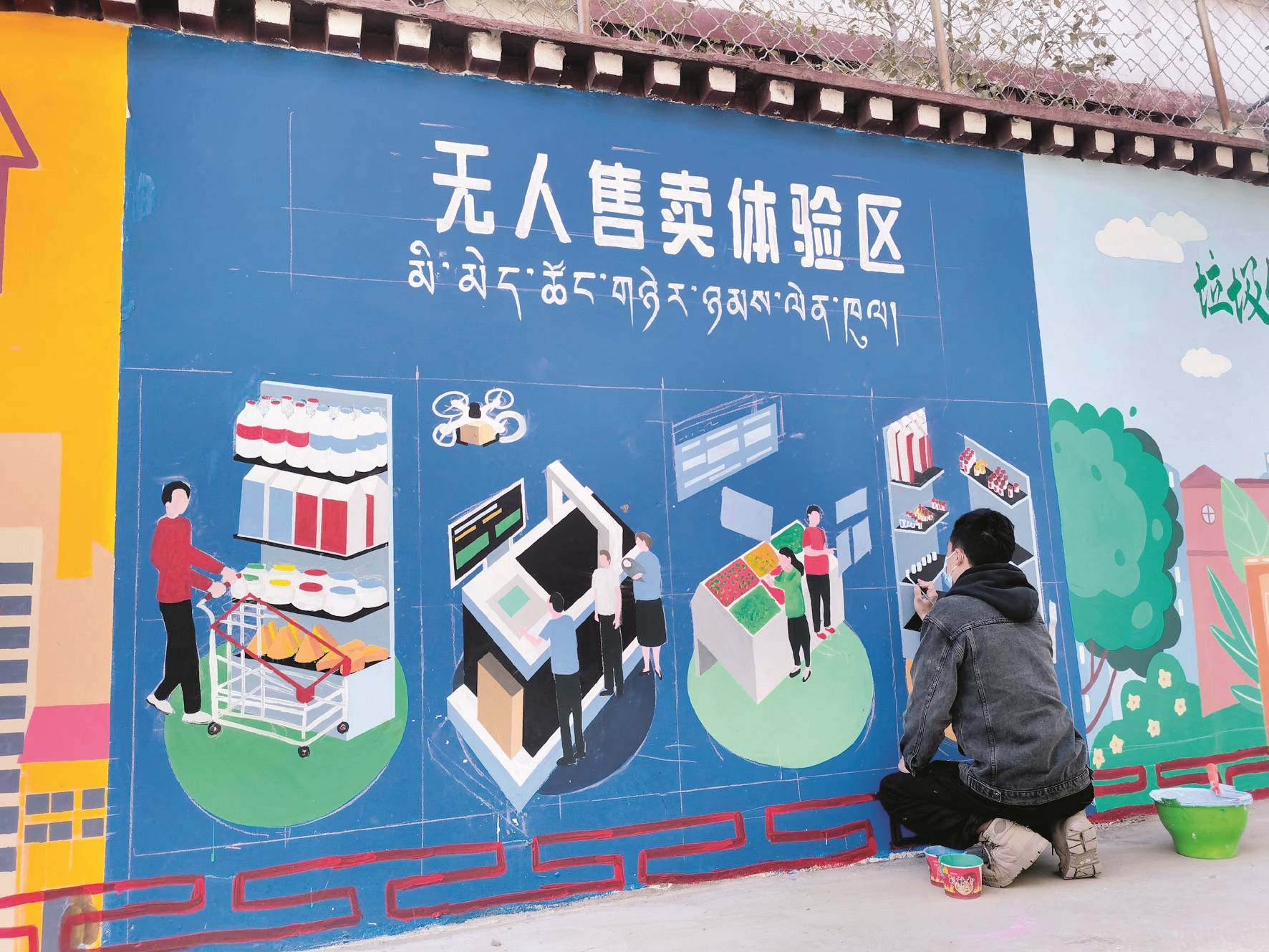 近日,記者在繞賽社區(qū)哈達巷里看到,有三名工作人員正在給西墻進行繪畫藝術(shù)創(chuàng)作,整體的墻繪已經(jīng)基本形成,正對一些細節(jié)進行補充,引來不少過往群眾圍觀拍照。墻繪顏色鮮艷、主題突出,分為四個板塊,分別是爭當文明志愿者體驗區(qū)、文明問答體驗區(qū)、無人售賣體驗區(qū)、垃圾分類體驗區(qū)。