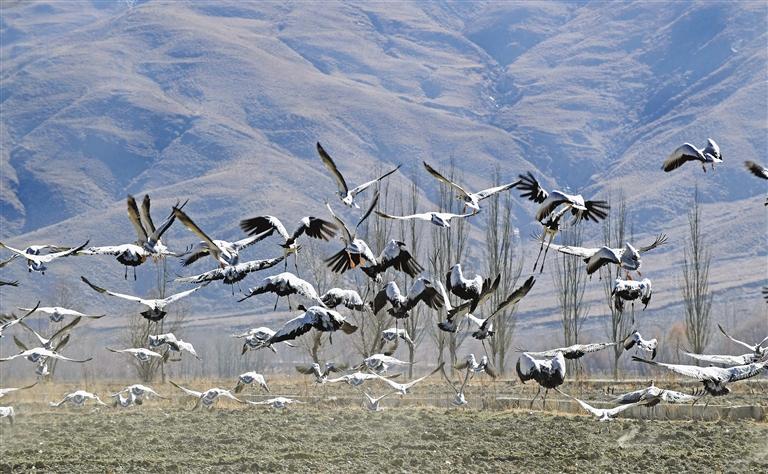 冬日的山南,又一次迎來了一群特殊的客人——黑頸鶴。成群的黑頸鶴在田野悠閑地覓食、嬉戲,給冬季增添了生機和活力,呈現(xiàn)出一幅人與自然和諧相處的絕美畫卷?! ?/p>