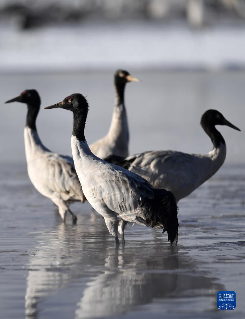 在拉薩市林周縣境內(nèi)越冬的黑頸鶴(2月22日攝)。新華社記者 覺果 攝