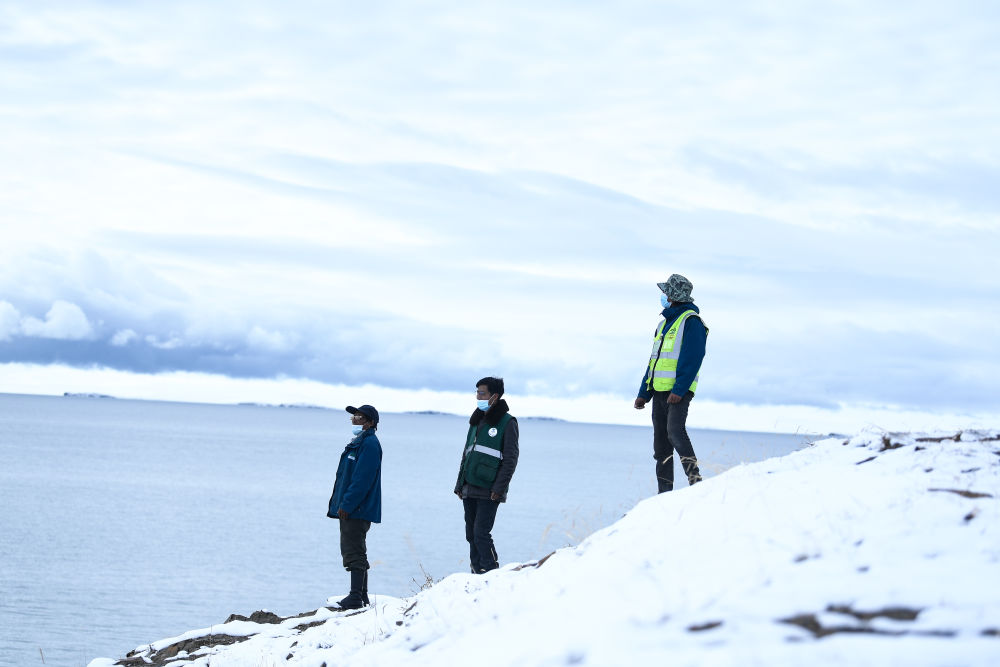 2021年10月20日,在青海省果洛藏族自治州瑪多縣扎陵湖鄉(xiāng)勒那村,三江源國家公園黃河源園區(qū)生態(tài)管護(hù)員在扎陵湖畔巡護(hù)。新華社記者 李占軼 攝