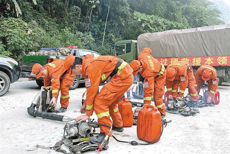 圖為在重特大森林火災(zāi)長(zhǎng)途機(jī)動(dòng)滅火增援實(shí)戰(zhàn)演練過(guò)程中,消防救援人員對(duì)裝備進(jìn)行檢查維修。圖片由昌都市森林消防支隊(duì)提供