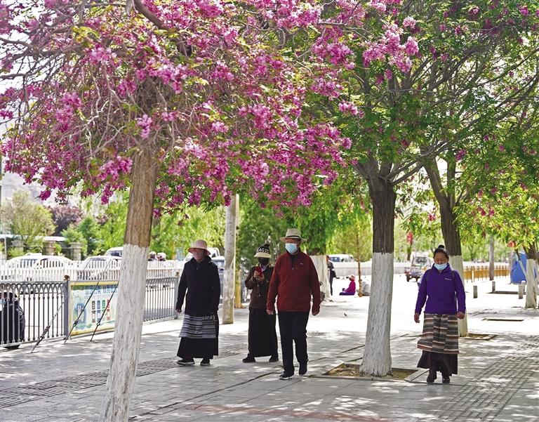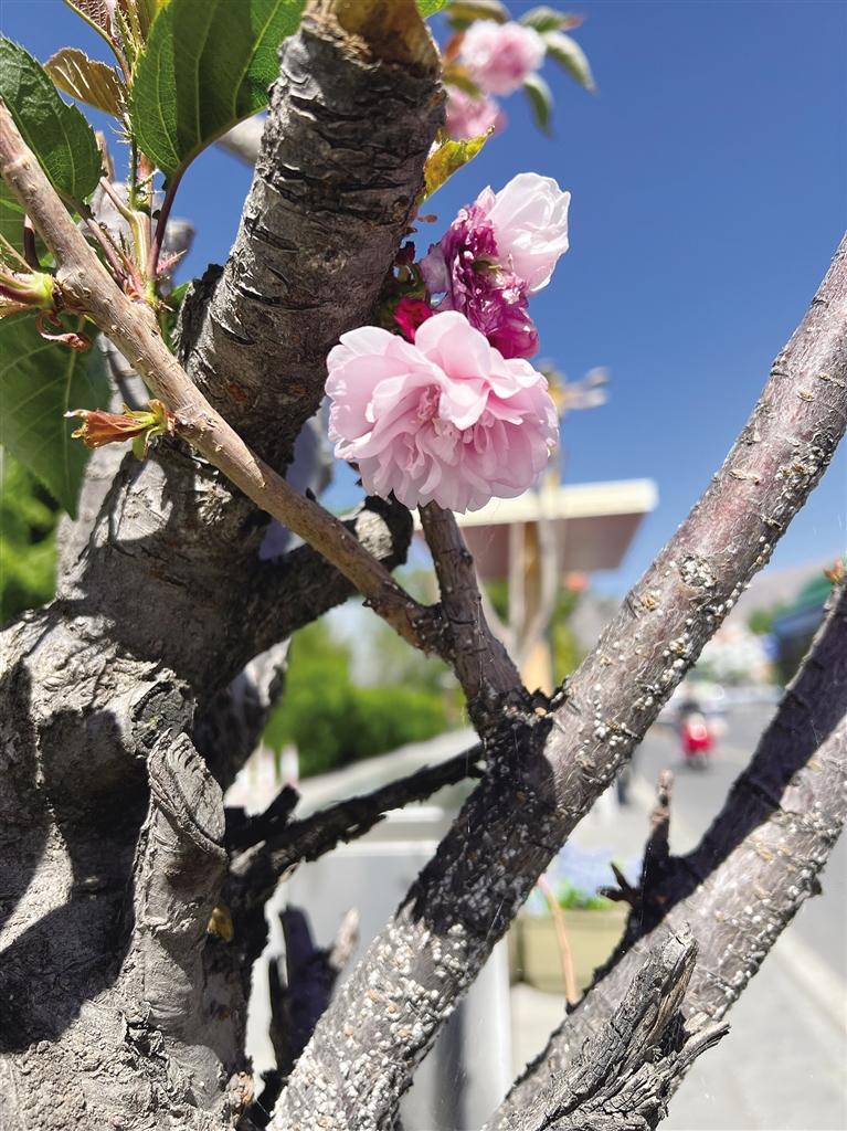 如今,走在市區(qū)街頭或公園,隨處可以看到開花的樹種,有的已經凋零,有的開得正艷,有的含苞待放。在布達拉宮腳下的北京中路道路兩側櫻花全面盛開,粉紅色的櫻花宛如云霞,花瓣隨著微風簌簌落下,煞是浪漫。將初夏的北京中路裝扮成一幅美麗的畫卷,吸引許多市民和游客賞花拍照。