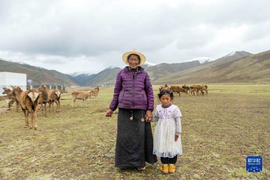 向秋拉姆和孫女在類烏齊馬鹿國(guó)家級(jí)自然保護(hù)區(qū)內(nèi)合影(5月21日攝)。新華社記者 周荻瀟 攝