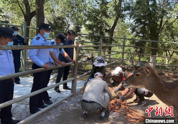 圖為青海省野生動(dòng)物救助中心工作人員對白唇鹿進(jìn)行檢查?!〖庠h公安局供圖