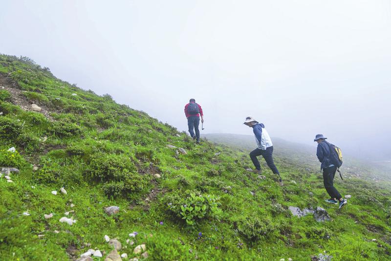 垂直距離只有300米,但密林中的行進(jìn)并不容易。在向?qū)ьI(lǐng)下,王文志和其學(xué)生抵達(dá)了林線處,腳踩松軟的苔蘚,他們展開(kāi)作業(yè)。