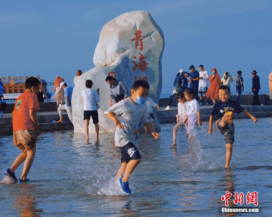 圖為游客在青海湖畔水中玩耍。馬銘言 攝