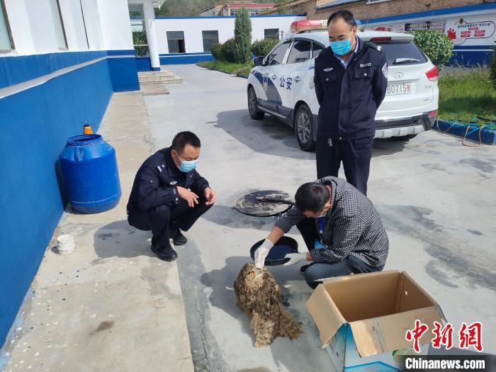 圖為互助縣野生動物保護(hù)管理部門工作人員正在檢查國家二級保護(hù)野生動物雕鸮受傷情況?!』ブ补﹫D