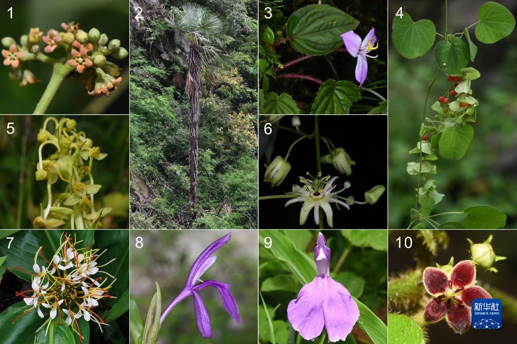 圖為:1、吉隆牛奶菜;2、塔基棕櫚;3、喀西蜂斗草;4、旋花錫生藤;5、吉隆角盤蘭;6、尼泊爾西番蓮;7、橢穗姜花;8、藏南象牙參;9、象牙參;10、箭藥藤(中國(guó)科學(xué)院西雙版納熱帶植物園供圖)